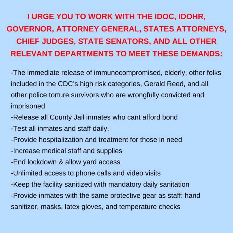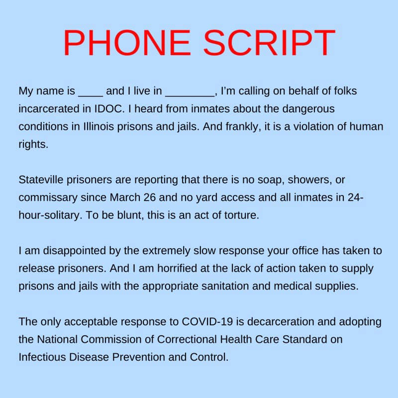 We can make a difference, but we need to call elected officials in Chicago and Illinois & support Illinois's proactive Governor, JB Pritzker, who has moved to decarcerate people to keep them safe & well.
