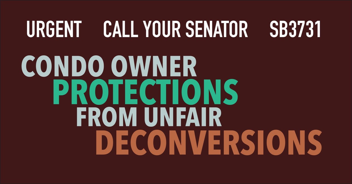 Aside from this, a number of predatory practices aimed at homeowners and from developers/buyers/their agents have taken place--owners are frequently sent repeated, unwanted solicitations, and during a deconversion process, it is often no holds barred--one condominium unit's owners were subjected to over 10 text messages in a row in furtherance of the developer's wishes, beginning before 4:00 am on a weekday. State Senator Sara Feigenholtz has introduced legislation to try to protect homeowners, and in collaboration with our organization, a bill has been drafted and introduced to protect homeowners. This bill, SB 3731 is not only critical, but there are two impediments to it: (1). Because of COVID19, the Illinois General Assembly will only be in session from May 20-29. and (2). Prior bills of this nature have failed because while developers are vocal, NO ONE whose homes are at stake has been calling their state elected officials to try to get these bills passed.